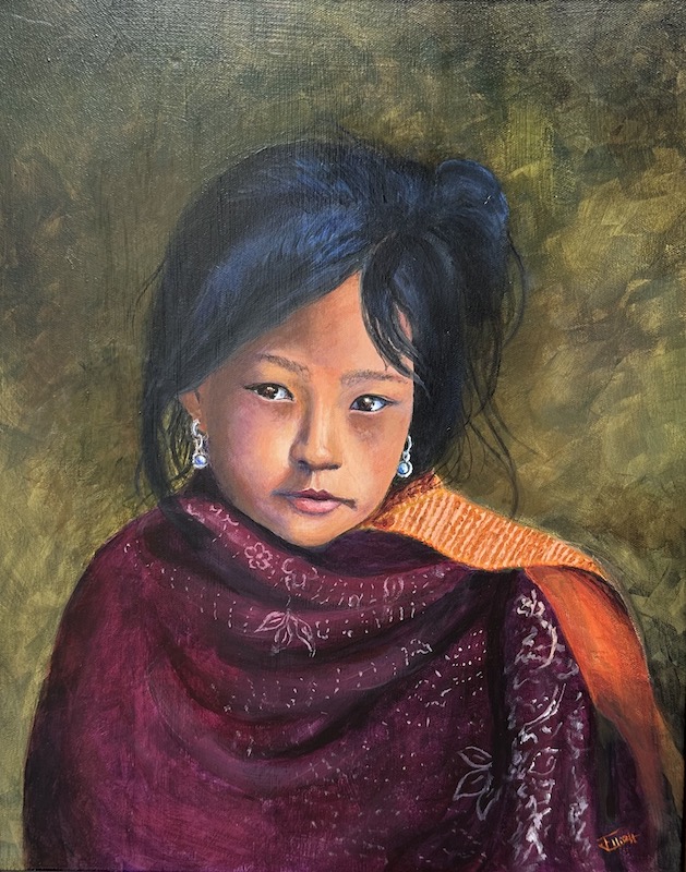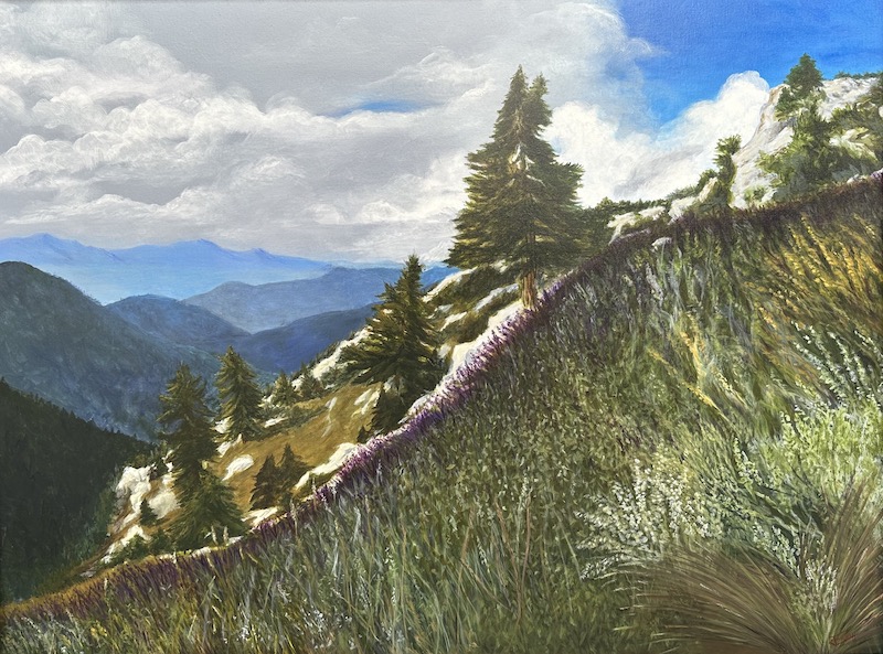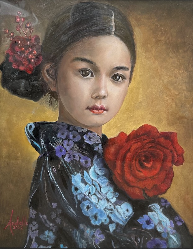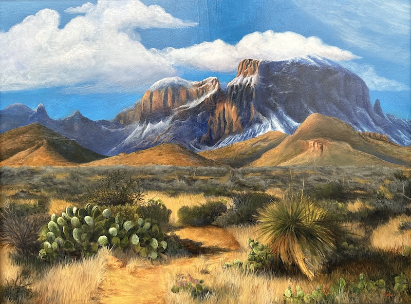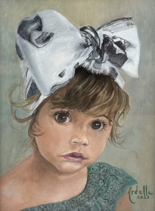 From left to right: Erika Szombathy “Attila”, Dwight Schaeper “Christmas on the Farm”, Mollie Holton “Courtship”, Ardelle Fisher “Girl with Red Flower”, Janim Vander Berg “Protector”, Jessica Johnson “Crystal Mountain”, Melanie Fox “Flowers in her Hair”, Jim Elliott “Snow in Guadalupe Mountains”, Michelle Smith “Bloom”, Michelle Smith “My First Oil Painting”, Monica Sinnott “Chris’s Bird”, Rebecca Morrison “Forrest Falls”, Shirley Looney “Tranquility”, Dorothy Foshat “Young and Innocent”