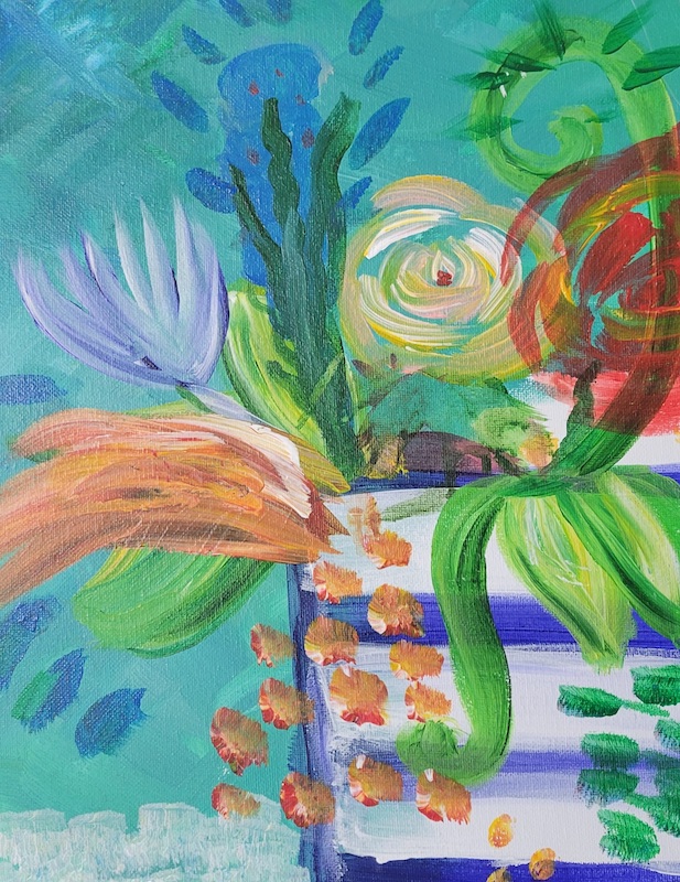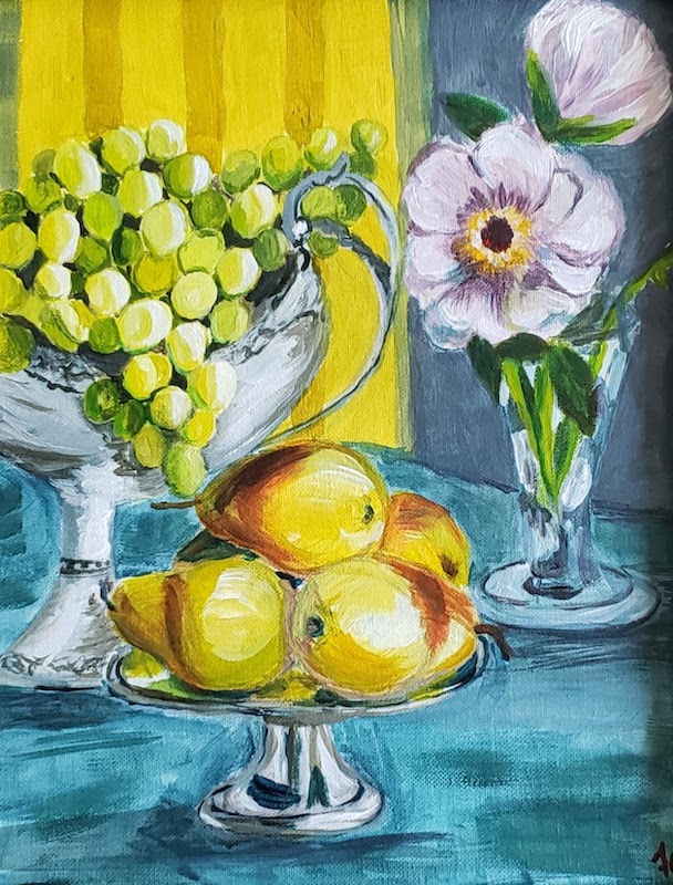From left to right: Jessica Ohrel (Adult) “Spider Orchid”, Ashley Castillo (Teen) “Passenger”, Yunxi He (Teen) “Arnold”, Katie McCroskey (Teen) “Cherries”, Ayana Johnson (Teen) “Portrait of a Man”, Emma Shekari (Age 9-12) “A Colorful Cupcake”, Arhaan Rai (Age 9-12) “Stallion”, Brianna Kalis (Age 9-12) “Vases”, Aathmika Karthick-Subhashini (Age 9-12) “Sunset Mountains”, Amanda Marti (Age 6-8) “The Good Fox”, Oliver Schnyder-Alonso (Age 6-8) “The Tangerine”, Chris Lin (Age 6-8) “Hello Spring”, Impana Shashidhar (Age 4-5) “Mona Lisa”, Heather Isetts (Adult Ceramics) “Untitled”