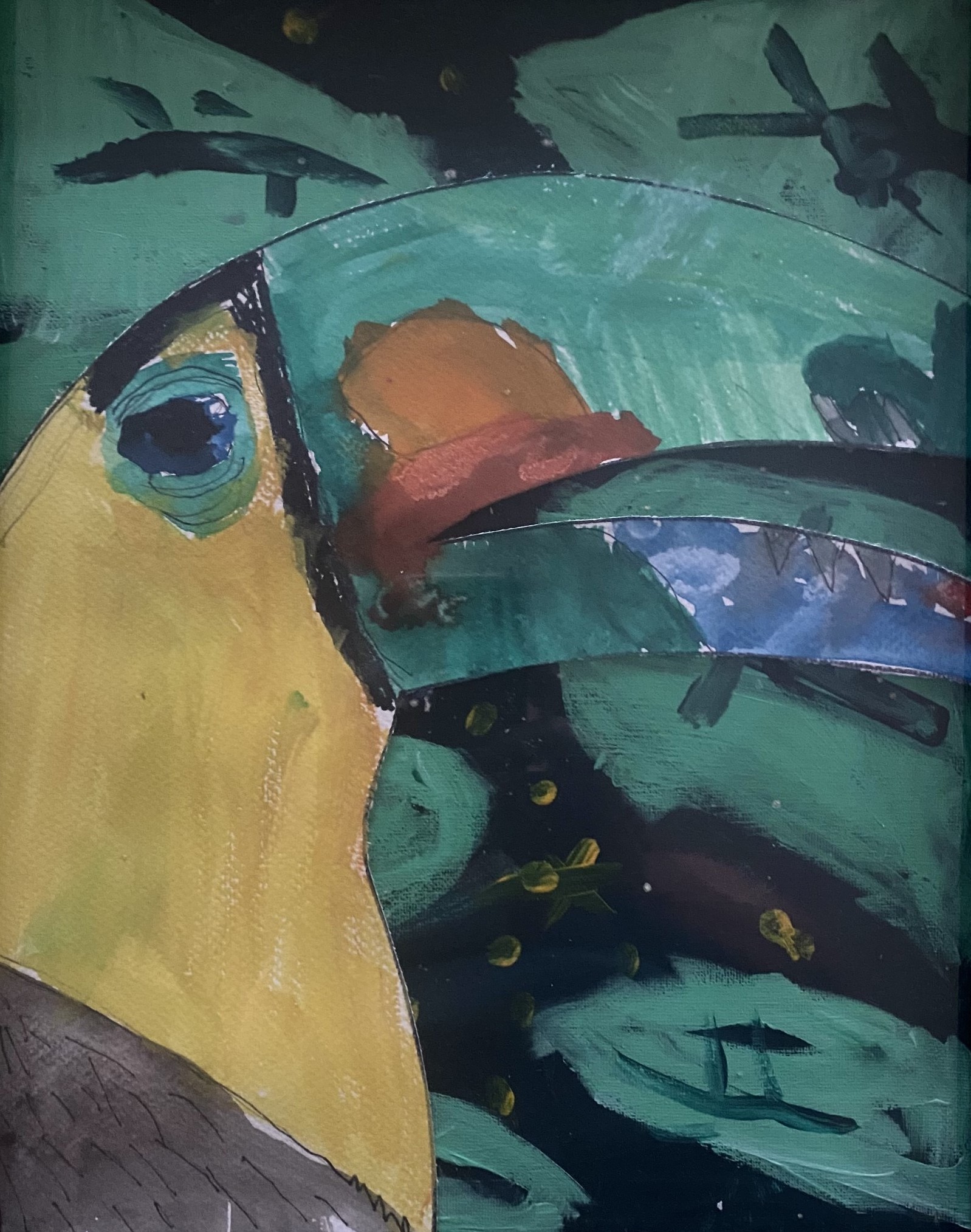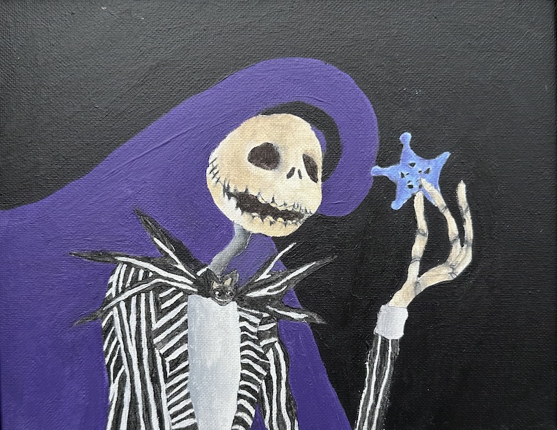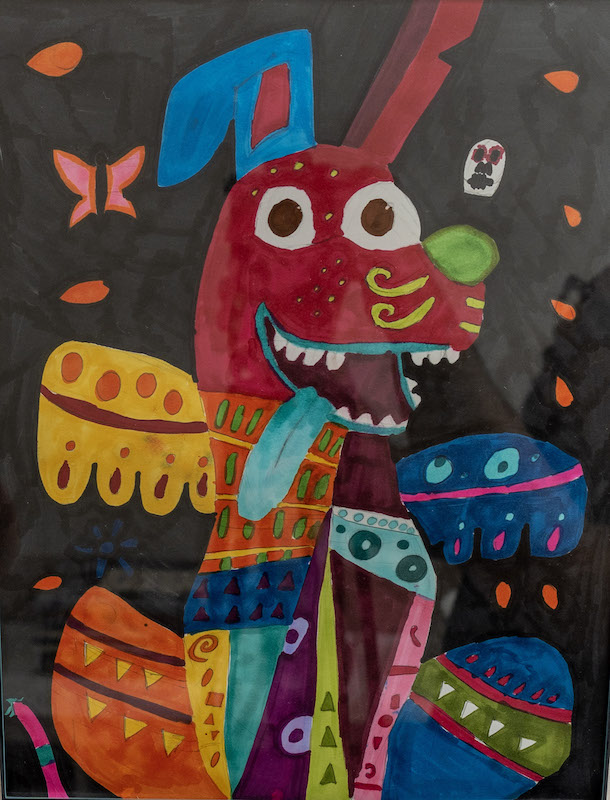 From left to right: Davis Wade “Wrath of the Dead”, Avery Santizo “Unicorn”, Mia Lewis “Jason”, Emma Driscoll “Self-Portrait”, Sarah Galindo “Head in the Trees”, Grace Duncum “Flowery Heaven”, Amanda Marti “The Winter Tiger”, Samantha Serrano “Samantha’s Fish”