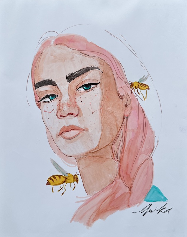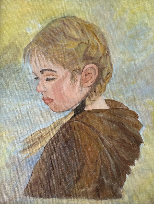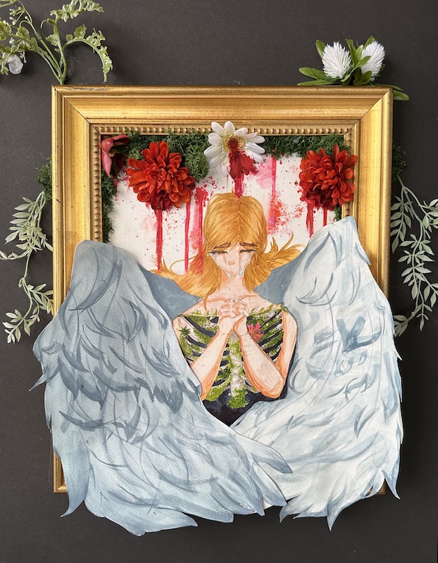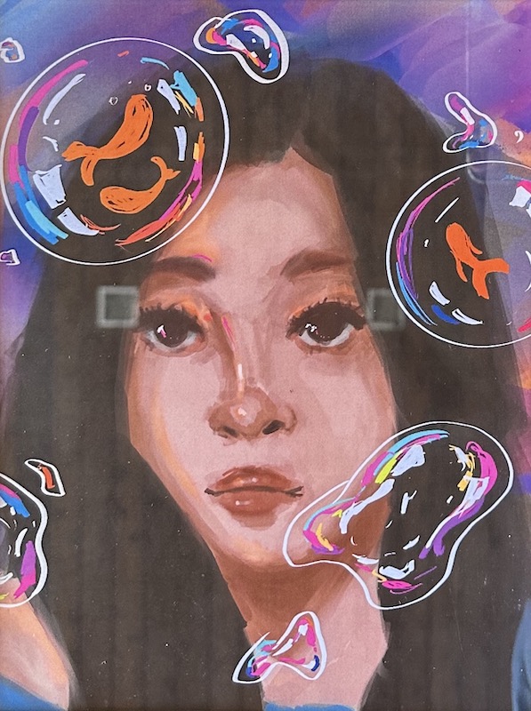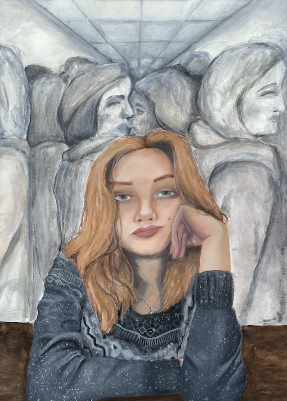 From left to right: Alexis Travis “Blinding Beauty”, Anika Titsworth “Pink Hair and the Bees”, Bella Krieger “Cooler than Me”, Lotta Quisbrock “Hidden Pressure of Society”, Joy Kim “MId Summer Night’s Dream”, Sierra Buchmann “Dreams to be Seen”, Ashley Castillo “Passenger”, Yunxi He “Arnold”, Katie McCroskey “Cherries”, Angelina Riser “Tearful”, Nadia Rios “A Horseshoe on the Shore”, Hadley Nattress “The Apology”, Nadia Rios “Bride of Frankenstein”, Elisabeth Lake “Freshwater Lake”