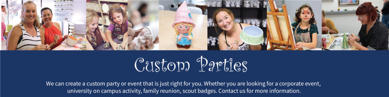 Party guests choose their own pottery piece, pick their glazes, and paint their piece. Staff members will give painting tips and help as needed. Pottery will be ready for pick up 1 week from the date of the party to allow time to dry and kiln-fire.